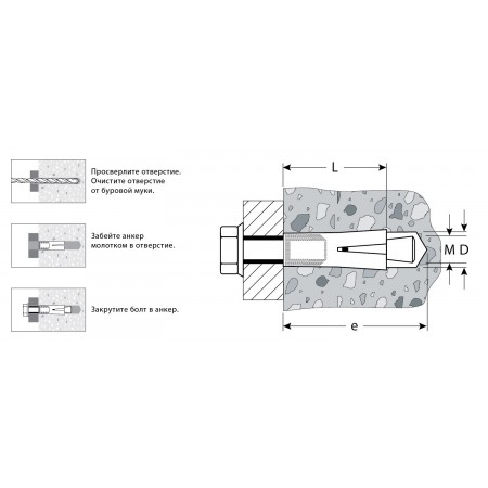 Для монтажа конструкций к полнотелым основаниям: поверхностям из бетона, полнотелого кирпича или природного камня. Анкер устанавливается в предварительно просверленное и очищенное от буровой муки отверстие и расклинивается при закручивании болта