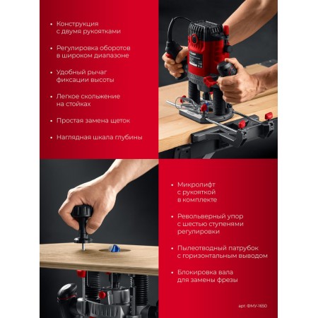 - Функция микролифта с комплектной рукояткой позволяет регулировать вылет фрезы при установке ″в стол″