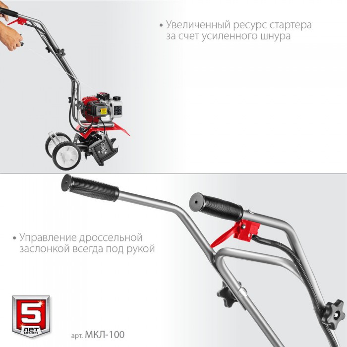 Лёгкий и манёвренный культиватор с двухтактным двигателем для рыхления и культивации почвы на приусадебном участке. Сошник позволяет контролировать величину заглубления. Складная рукоятка и транспортные колеса облегчают эксплуатацию, транспортировку и хранение.