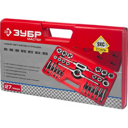 Набор предназначен для резьбонарезных работ в конструкциях и заготовках из сталей и цветных металлов. Метчики ручные однопроходные используются для нарезания внутренней метрической резьбы с нормальным шагом в глухих и сквозных отверстиях. Плашки предназначены для нарезания внешней метрической резьбы с нормальным шагом. Метчикодержатель предназначен для надежного закрепления метчиков Плашкодержатель используется для закрепления плашек при проведении резьбонарезных работ