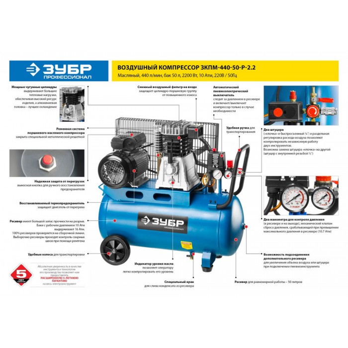 - Контроль давления в ресивере и на выходе при помощи двух манометров