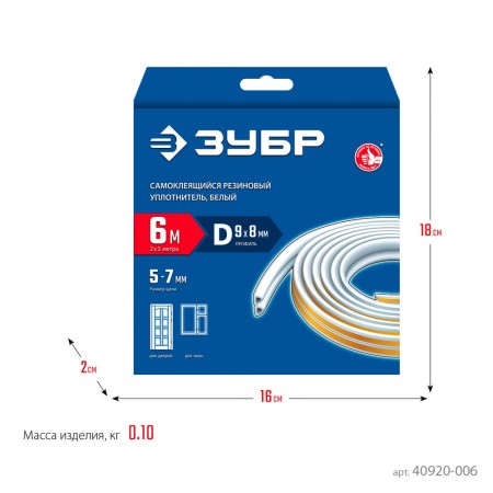 Уплотнитель резиновый самоклеящийся 6 м, D-профиль, размер 9 х 8 мм, белый ЗУБР Профессионал 40920-006_z01