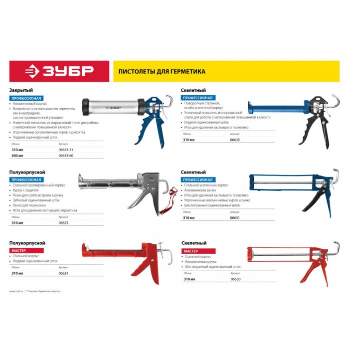 Пистолет для герметиков ЗУБР подходит для работы с герметиками в алюминиевой фольге и пластиковых картриджах объемом до 600 мл, эргономичная форма рукоятки создает комфортные условия работы, а усиленный толкатель позволяет работать с составами любой вязкости. Изготовлен из особопрочных материалов. Оснащен иглой для удаления застывшего герметика/клея.