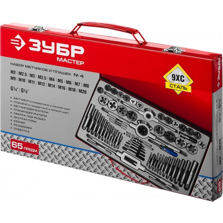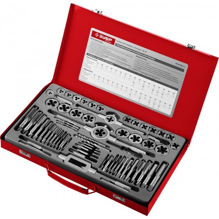 Набор предназначен для резьбонарезных работ в конструкциях и заготовках из сталей и цветных металлов. Метчики ручные однопроходные используются для нарезания внутренней метрической резьбы с нормальным и мелким шагом в глухих и сквозных отверстиях. Метчик трубный предназначен для нарезания внутренней трубной резьбы. Плашки предназначены для нарезания внешней метрической резьбы с нормальным и мелким шагом. Плашка трубная используется для нарезания трубной резьбы Метчикодержатель предназначен для надежного закрепления метчиков Плашкодержатель используется для закрепления плашек при проведении резьбонарезных работ Резьбомер предназначен для подбора необходимого шага метрической резьбы. Кернер используется для предварительного накернивания перед засверливанием. Экстрактор конический с обратной резьбой предназначен для извлечения обломанных болтов и шпилек