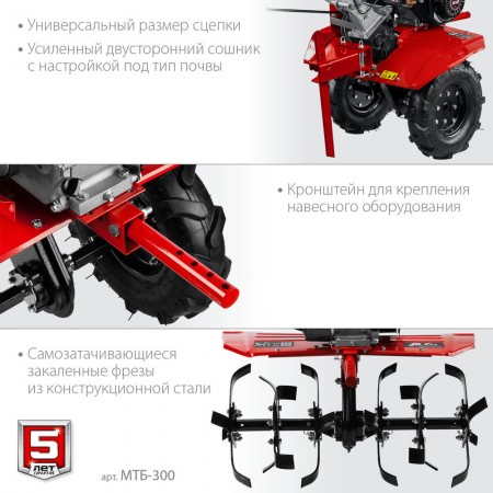 - Универсальная сцепка позволяет использовать различное навесное оборудование
