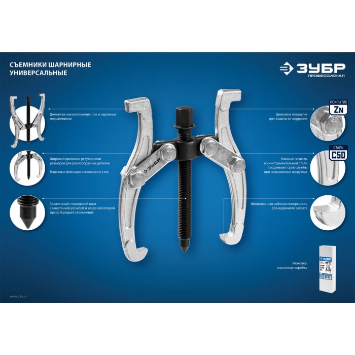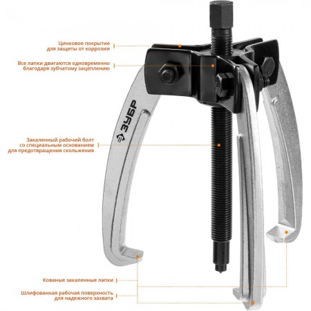Захваты съемника выкованы из качественной инструментальной стали, что обеспечивает долгий срок службы при работе с высокими нагрузками.