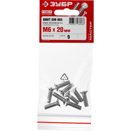 Винт с потайной головкой M6?20 мм DIN 965 кл. пр. 4.8 цинк 9 шт ЗУБР 303116-06-020