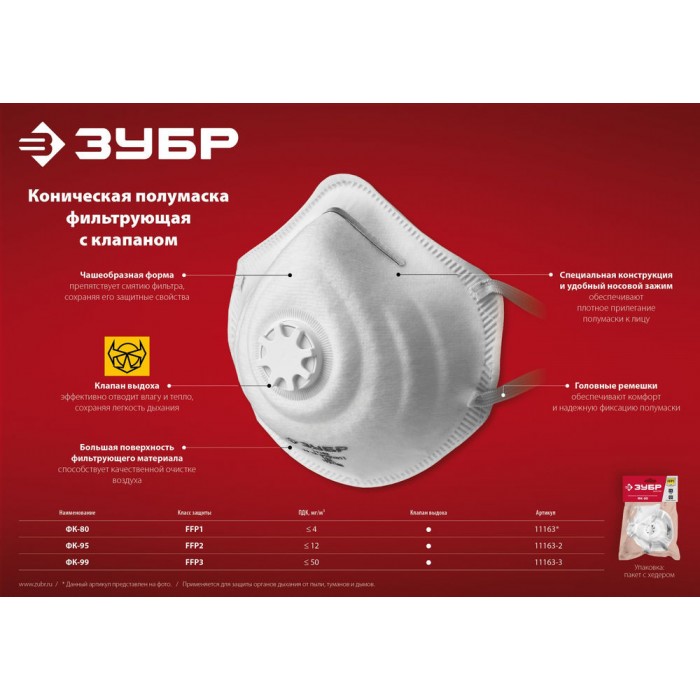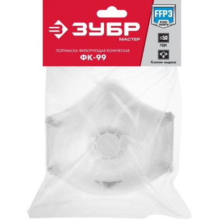 Полумаска фильтрующая ФК-99 коническая, с клапаном выдоха, класс защиты FFP3 ЗУБР 11163-3