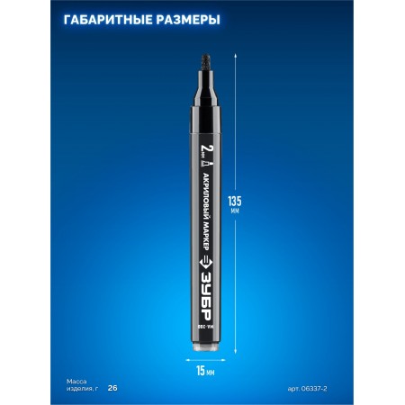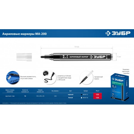 Маркер акриловый с пулевидным наконечником. Пишет практически на любых поверхностях. Водная основа экологична и не пахнет. Акриловая краска обладает повышенной укрывностью.