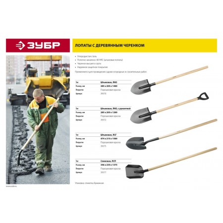 Штыковая лопата 285 х 205 х 1430 мм полотно 1.6 мм закалено дерев. черенок высш. сорт тип ЛКО ЗУБР Мастер 39570