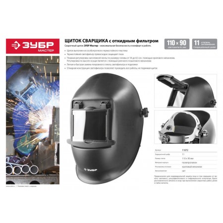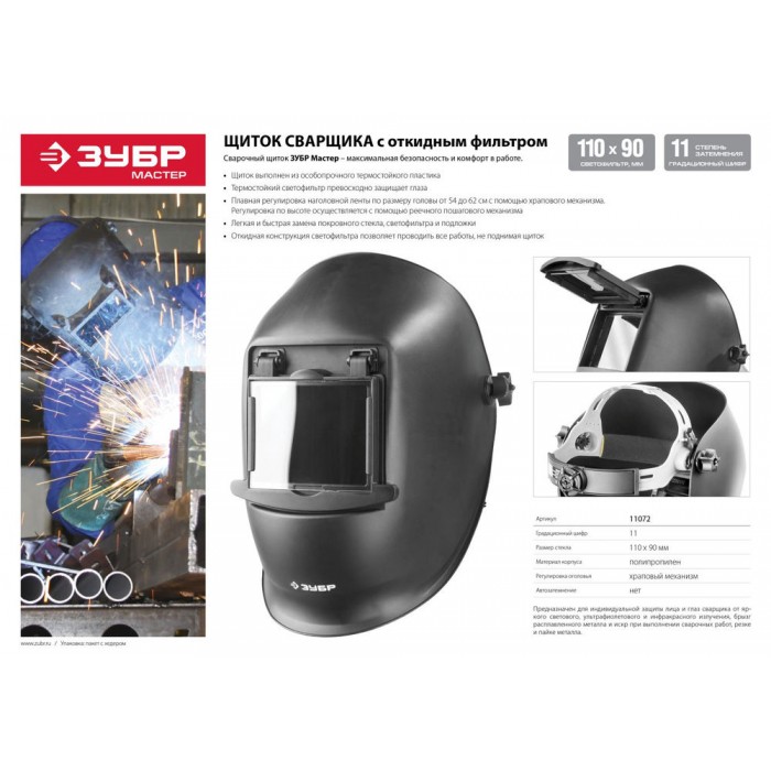 Сварочный щиток ЗУБР предназначен для индивидуальной защиты лица и глаз сварщика от яркого светового, ультрафиолетового и инфракрасного излучения, брызг расплавленного металла и искр при выполнении сварочных работ, резки и пайки металла.