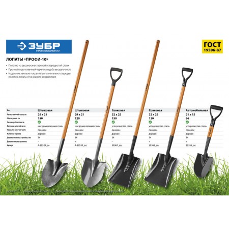 Штыковая лопата тип ЛСГ 290 х 210 х 1200 мм полотно 1.7мм закалено черенок из дуба высш. сорта с рукояткой Профессионал ЗУБР Профи-10 4-39530
