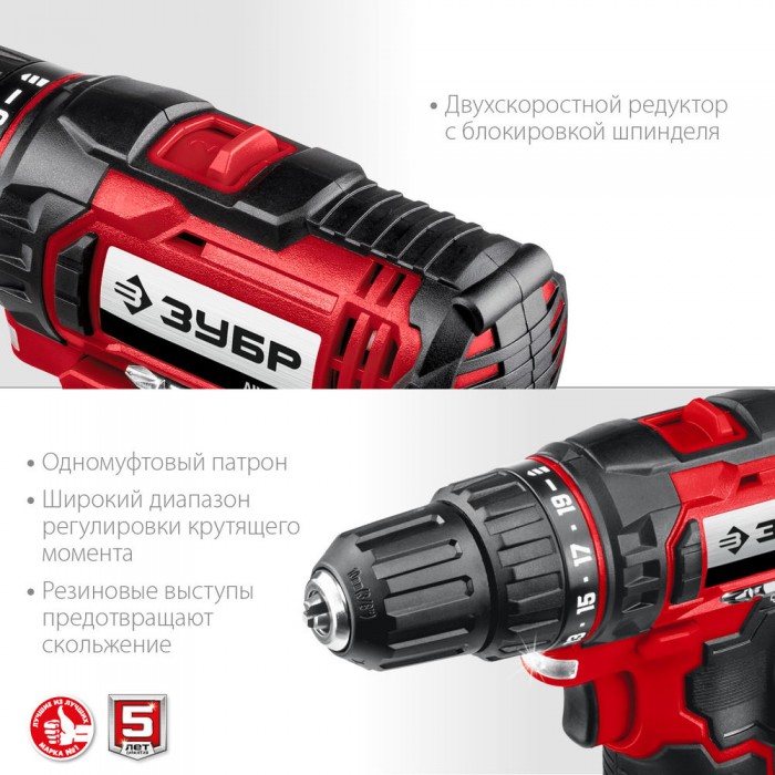 - Двухскоростной планетарный редуктор позволяет как заворачивать с большим крутящим моментом, так и сверлить на высоких оборотах