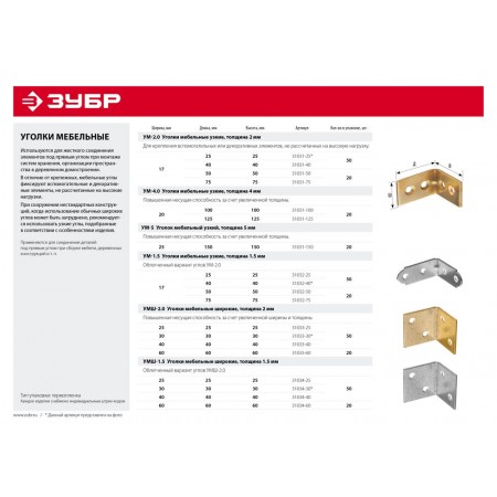 Для соединения деталей под прямым углом при сборке мебели, деревянных конструкций и т.п.. Предназначены для фиксации вспомогательных и декоративных элементов, не рассчитанных на высокие нагрузки. Для крепления конструкций к полнотелым основаниям необходимо использовать дюбель-гвозди. При сооружении нестандартных конструкций могут возникать ситуации, когда монтаж с использованием обычных широких углов может неосуществим. В таких случаях рекомендуется использовать узкие углы и подбирать размер и толщину изделия, учитывая характер и особенности конструкции.
