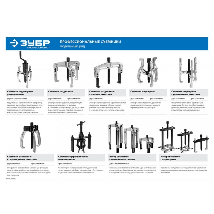 Захваты съемника выкованы из качественной инструментальной стали, что обеспечивает долгий срок службы при работе с высокими нагрузками. Позволяет работать с широким рядом узлов