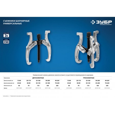Съемник внешний d 40 - 265 мм внутренний d 70 - 230 мм шарнирный трехзахватный Профессионал ЗУБР 43318-205